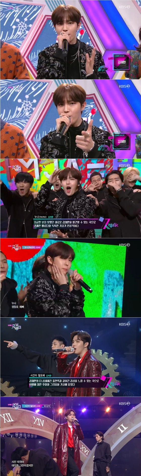 이날 김재환은 더블 타이틀곡인 '누나'로 컴백 무대 포문을 열었다. 김재환은 발랄하고 통통튀는 매력을 뽐냈다. 이어 '시간이 필요해'로 반전 매력을 선보였다. 앞선 무대에서는 귀여움을 뽐냈다면 이번엔 절절한 보이스로 마음을 울렸다.