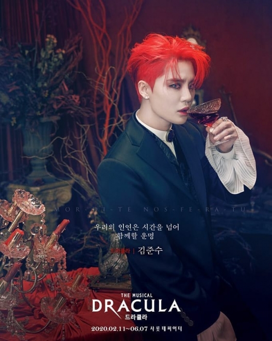 공개된 사진 속 김준수는 '드라큘라' 컨셉에 맞게 빨간색 염색 머리에 빨간 액체가 담긴 유리컵을 입에 대고 있다. 강렬한 아이 메이크업과 렌즈로 파격적인 이미지 변신을 꾀했다.