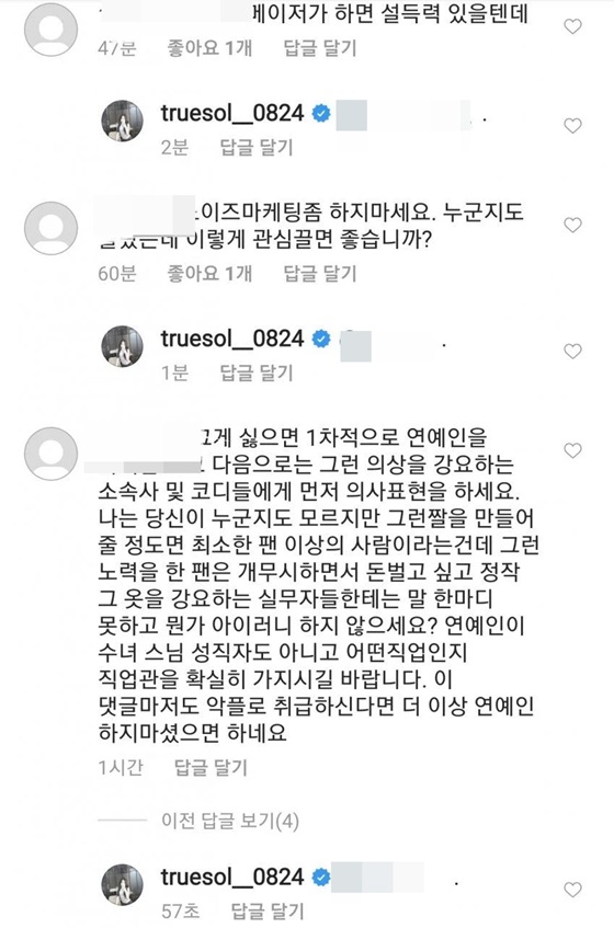이 같은 진솔의 대처에 네티즌들도 반응했다. 이들은 "성희롱을 정당화하지 말라", "성희롱이 당연한 직업은 없다"라고 악플러를 응징하며 진솔을 보호했다.