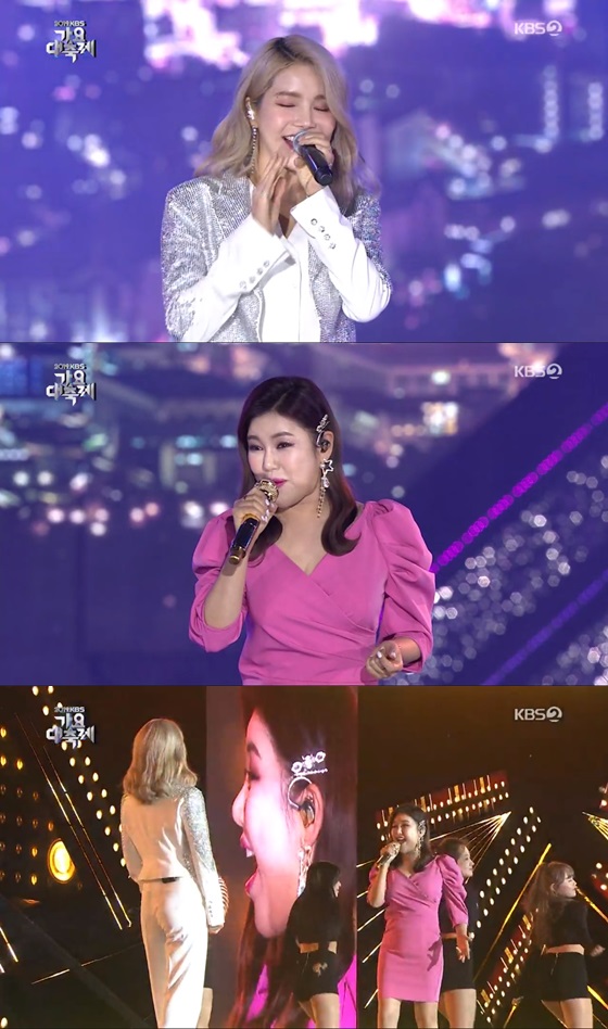 27일 오후 KBS 2TV에서 방송된 '2019 KBS 가요대축제'에서는 송가인과 솔라가 주현미의 '신사동 그 사람'과 윤수일 '황홀한 고백'을 부르는 모습이 그려졌다.