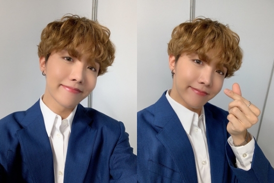 공개된 사진 속 제이홉은 네이비색 자켓을 입고 셀카를 찍고 있는 모습이 담겼다. 특히 제이홉은 손가락으로 하트를 만든 채 예쁜 미소를 짓고 있어 시선을 사로잡는다.