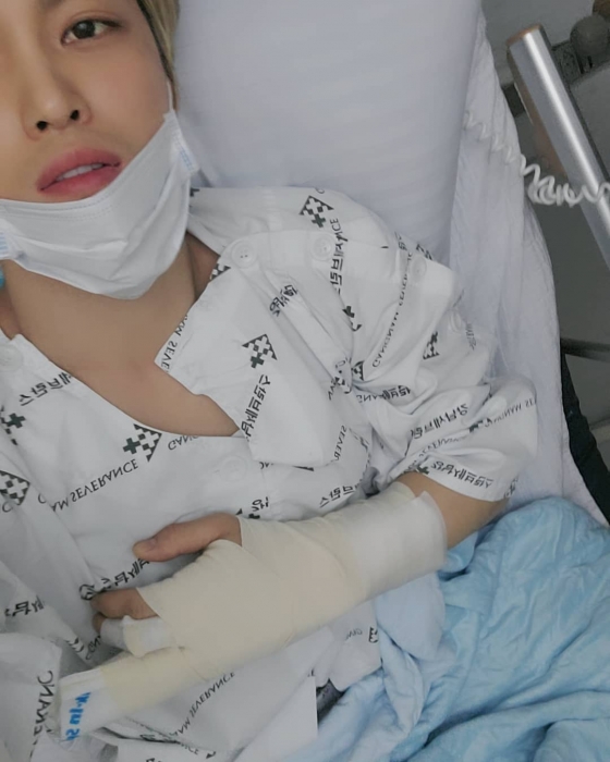 공개된 사진 속 김재중은 손가락에 붕대를 감은 후 한 병원의 병실 침대에 누워 있다.