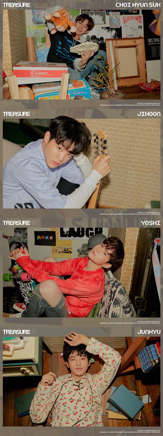 YG엔터테인먼트(이하 YG)는 8일 정오 공식 블로그에 트레저 멤버 최현석, 지훈, 요시, 준규의 프로필 이미지를 공개했다. 사진 속 4명의 멤버는 10대 소년들의 자유분방함과 건강한 에너지를 느낄 수 있는 아지트를 배경으로 저마다 개성 넘치는 패션과 비주얼을 뽐냈다.