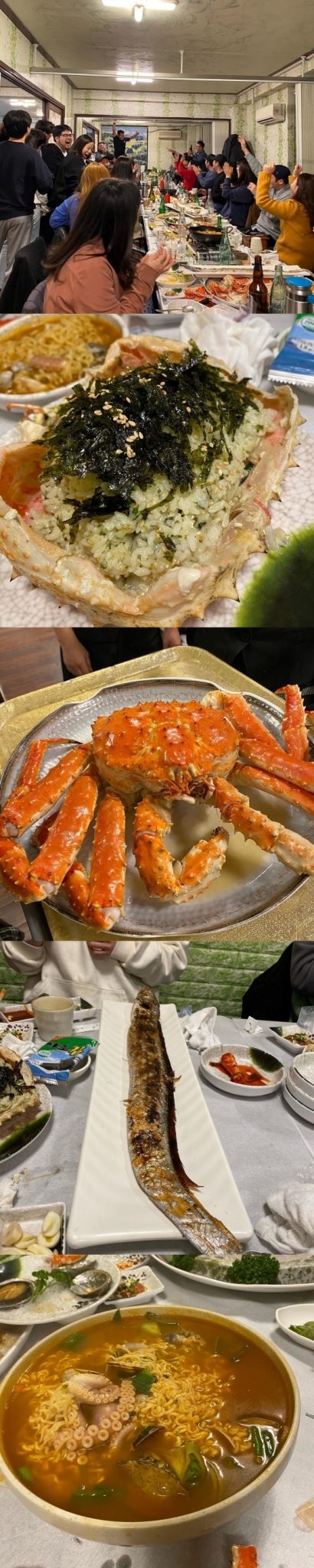 공개된 사진 속에는 게살 딱지 장과 킹크랩, 해물 라면 등 식욕을 돋우는 해물 음식들이 나열돼있다. 맨 마지막에는 사람들이 환한 표정을 지으며 손뼉 치고 있어 행복한 분위기를 보여줬다.