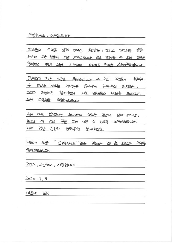 이어 "이어실 마음 한편에는 희미하게 먹먹한 감정이 남아 있지만, 앞으로 더 멋진 꿈을 그려 나갈 수 있도록 노력하겠다"며 "다음에 있을 '안녕하세요'라는 말 앞에는 더 큰 희망과 포부를 담아오겠다"고 덧붙였다.