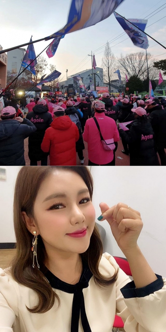 공개된 사진 속에는 송가인의 팬덤인 어게인(Again)이 자발적으로 맞춘 분홍색 캡 모자와 롱패딩을 입고 깃발을 흔들고 있다.