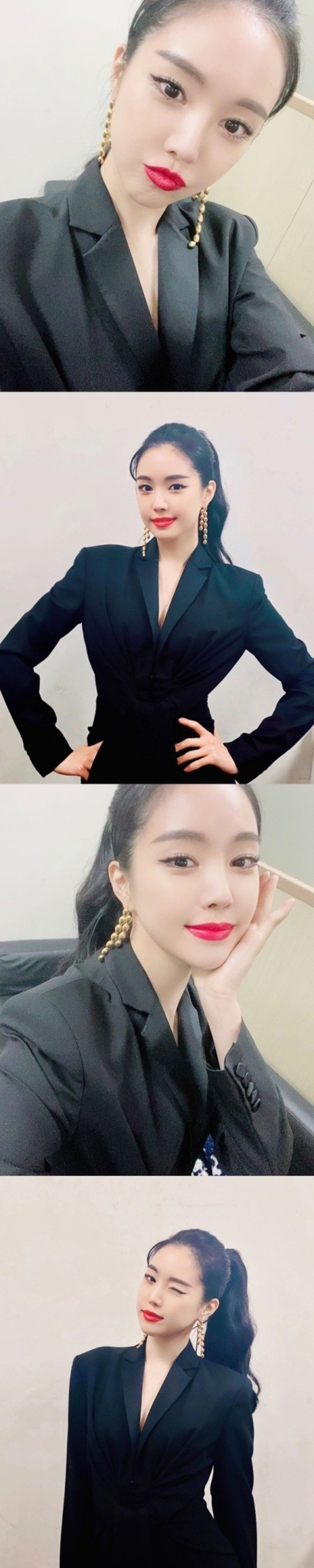 공개된 사진 속 손나은은 가슴골이 들여다보이는 검정 자켓, 레드립이 강조된 메이크업, 골드 귀걸이, 높이 묶어 올린 헤어스타일로 카리스마를 발산하고 있다. 그녀는 카메라를 향해 윙크를 하거나 입술을 삐죽 내미는 등 포즈로 남심을 저격했다.