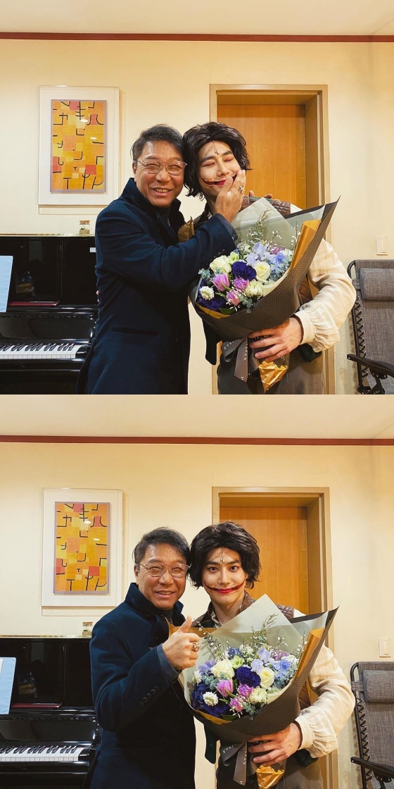 공개된 사진 속 수호는 뮤지컬 '웃는 남자'에 나오는 캐릭터 분장을 하고 사진을 찍고 있다. 특히 이수만과 다정하게 얼굴을 맞대고 카메라를 응시하고 있어 훈훈함을 자아냈다.