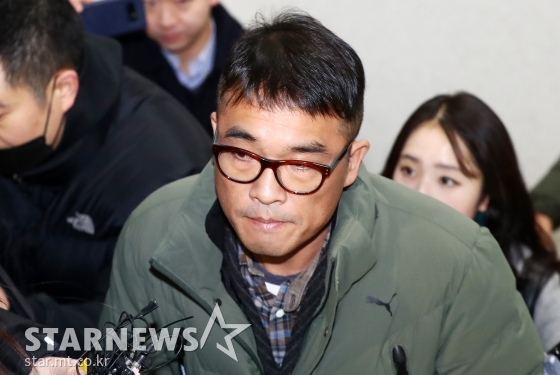 유흥업소 여종업원 성폭행 혐의를 받고 있는 가수 김건모가 지난 15일 오전 서울 강남경찰서에 피고소인 조사를 받기 위해 출석하고 있다. /사진=강민석 인턴기자