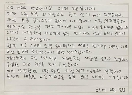 스윙 여러분 안녕하세요. 스누퍼 수현입니다. 제가 2월 3일 21사단으로 현역 입대하게 되었습니다. 사실 조금 갑작스럽게 군대에 가게 되어서 스윙 여러분들과 제대로 된 만남을 가지고 가지 못해 아쉽고 마음이 좋지만은 않습니다. 그래서 여러분들께 제 진심이 담긴 편지라도 전해 드리고 싶어서 이렇게 글 적어 봅니다!