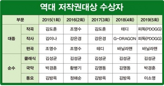 지난해에는 방탄소년단 프로듀서로 알려진 피독(PDOGG, 강효원)이 최초로 대중 분야 작사, 작곡 부문에서 동시에 대상을 차지했다. 이 밖에 총 다섯 번의 시상식에서 작곡가 김도훈, 조영수, 테디, 바닐라맨, 작사가 강은경 씨가 각각 2회 수상을 차지하며 대중음악을 이끌어가는 스타 뮤지션임을 널리 알렸고, 순수 분야에서는 김성균 씨가 클래식 부문에서 무려 5회 연속으로 수상했다.