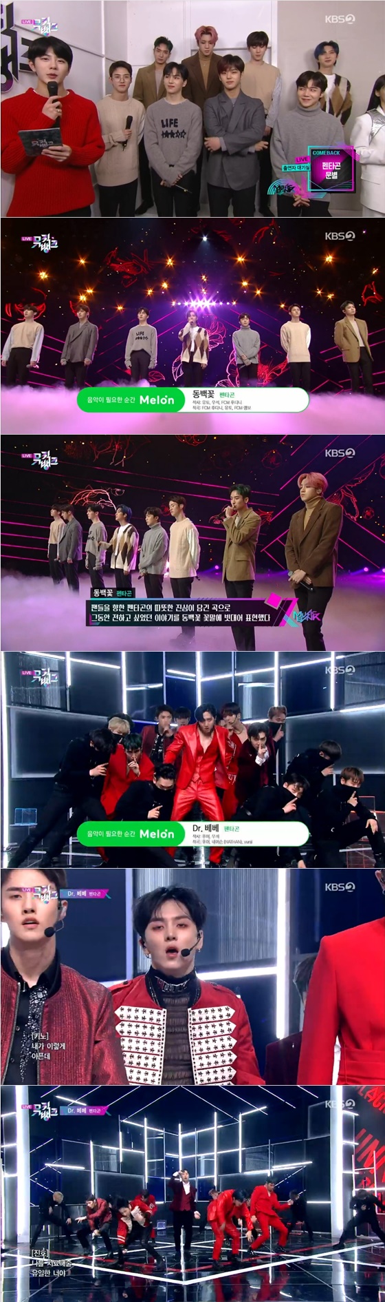무대에 오른 펜타곤은 수록곡 '동백꽃'으로 컴백 무대를 선보였다. 이들은 곡에 맞춰 감성 보이스를 자랑했다. 이어 타이틀곡 'Dr. 베베'로 무대를 화려하게 장식했다.