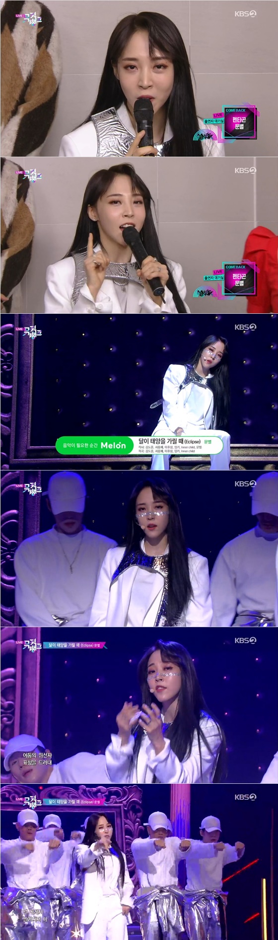 문별은 '달이 태양을 가릴 때'의 집중 포인트 세 가지로 강렬한 퍼포먼스, 중저음의 목소리, 다양한 스타일링을 꼽았다. 이후 문별은 '달이 태양을 가릴 때'에 맞춰 무대를 꾸몄다. 앞서 그가 말했듯 세 가지의 포인트를 강조해 무대를 장악했다. 걸크러시의 면모로 압도적인 몰입감을 선사했다.