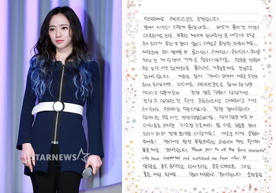 정말 많은 일들이 있었지만, 견딜 수 있었던 건 항상 응원해주시고, 아껴주시고, 사랑해주시는 팬 여러분 덕분이었어요. 정말 감사드립니다. 함께한 모든 시간 정말 행복했어요. 잊지 않을게요.