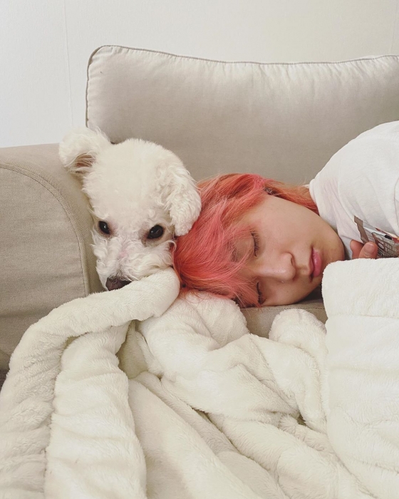 공개된 사진 속에는 반려견 소금이와 연인 던이 담겨 있다. 소금이와 머리를 맞댄 던은 편안한 자세로 자고 있어 여유로움이 느껴진다.