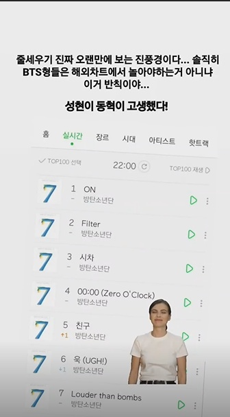 공개된 사진은 한 음원 사이트의 음원 순위다. 방탄소년단의 정규 4집이 끊임없이 이어져 있다. 방탄소년단은 지난 21일 정규 4집 ‘MAP OF THE SOUL : 7'을 발매한 후 폭발적인 인기를 받고 있다.
