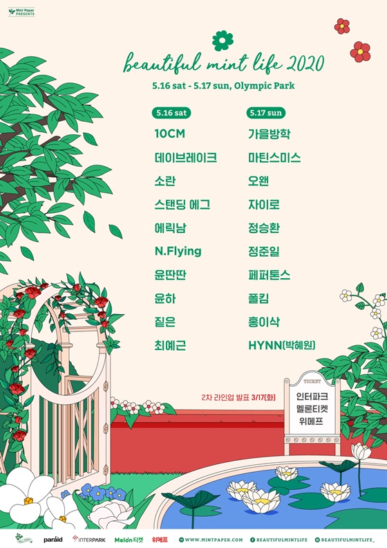 에릭남부터 정준일까지 20팀이 '뷰티풀 민트 라이프 2020' 1차 라인업에 이름을 올렸다.