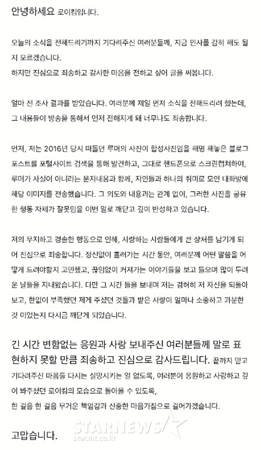 로이킴은 "저의 무지하고 경솔한 행동으로 인해, 사랑하는 사람들에게 큰 상처를 남기게 되어 진심으로 죄송합니다"고 했다. 그러면서 "정신없이 흘러가는 시간 동안, 여러분께 어떤 말씀을 어떻게 드려야 할지 고민했고, 끊임없이 커져가는 이야기들을 보고 들으며 많이 두려운 날들을 지내왔습니다. 다만 그 시간 들을 보내며 저는 겸허히 저 자신을 되돌아보고, 한없이 부족했던 제게 주셨던 것들과 받은 사랑이 얼마나 소중하고 과분한 것이었는지 다시금 깨닫게 되었습니다"고 밝혔다.