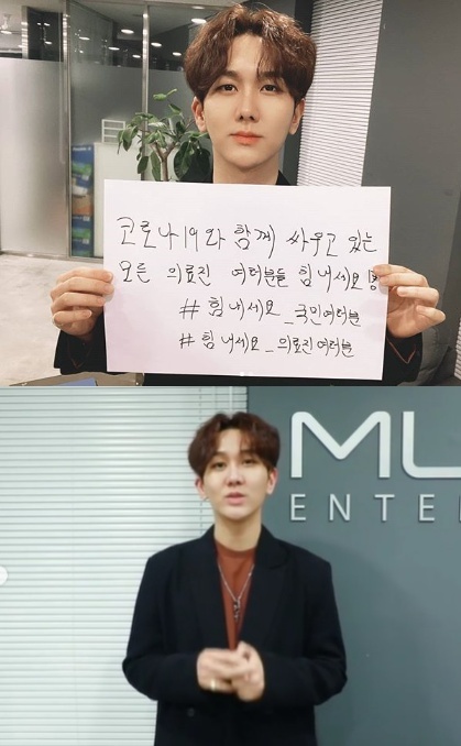 공개된 사진 속 김수찬은 자필로 '코로나19와 함께 싸우고 있는 모든 의료진 여러분들 힘내세요! 국민, 의료진 여러분 힘내세요'라는 글을 들고 사진을 찍었다.