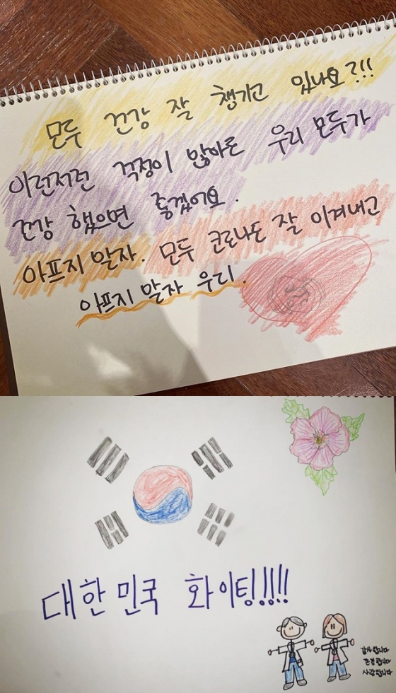 던은 스케치북에 태극기 문양과 무궁화, 의사 가운을 입고 있는 의료진들의 그림을 그렸다. 현아와 함께 코로나19 피해를 응원하는 모습으로 보인다.