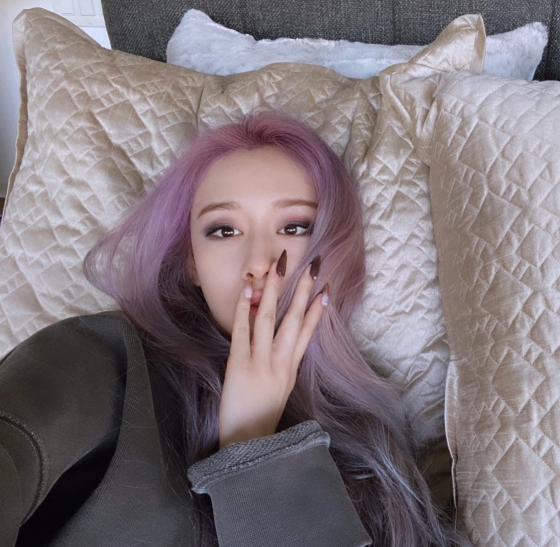 공개된 사진 속에는 보랏빛이 띄는 머리 색을 하고 손으로 입가를 가리고 있는 지연의 모습이 담겨있다. 특히 눈에 띄는 머리 색 덕분에 오묘한 분위기를 형성했다.