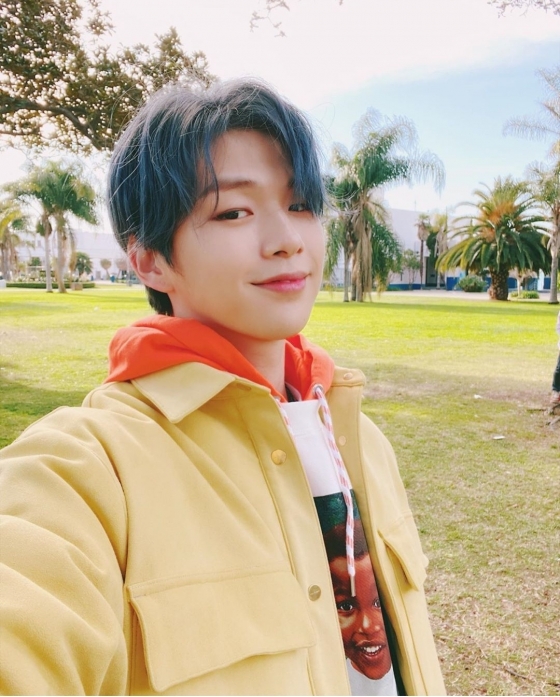 공개된 사진 속 강다니엘은 넓은 들판과 야자수 나무가 무성한 풍경을 배경으로 카메라를 환하게 웃으며 바라보고 있다. 노란색 재킷과 주황색 후드로 발랄함을 더했다.