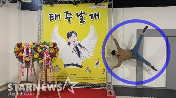 나태주는 18일 자신의 SNS를 통해 팬들이 선물한 화환과 포토월 앞에서 자신의 특기를 살려 촬영한 사진을 공개했다. 나태주는 팬들이 선물한 포토월에 몸을 가로로 매다는 개인기를 선보였다.