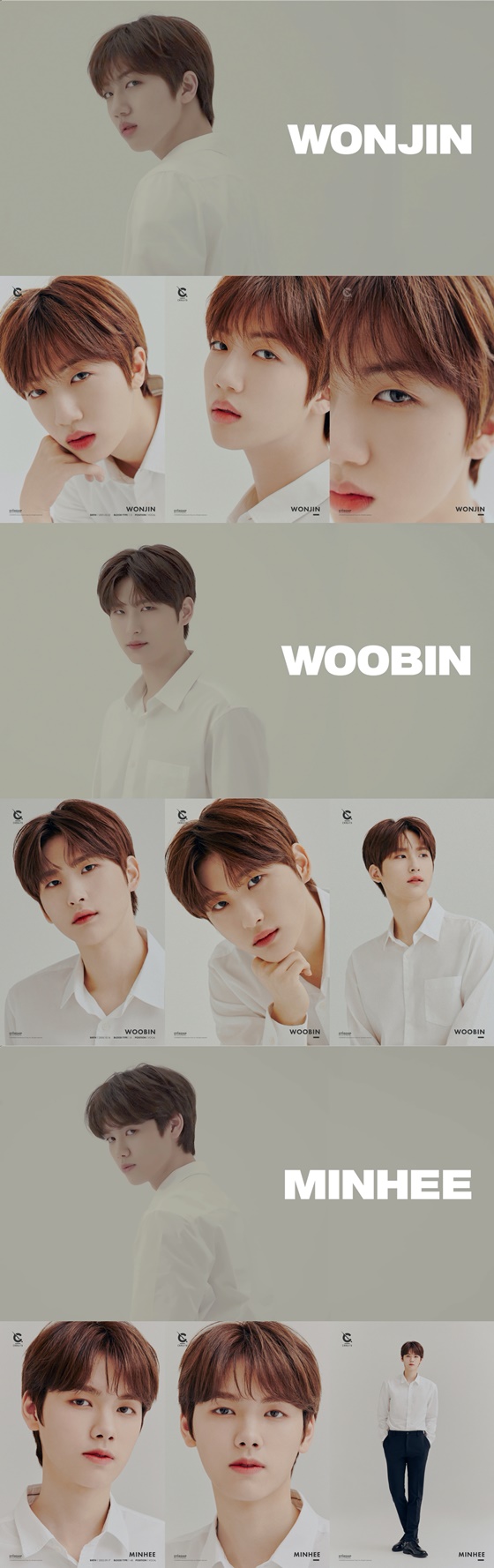 공개된 프로필 속 세 사람은 화이트 셔츠와 블랙 팬츠로 통일감 있는 패션을 완성, 맑고 순수한 이미지를 한층 배가시킨다. 깊은 눈빛과 시원시원한 마스크로 시크한 분위기를 드러낸 우빈을 시작으로 몽환적이면서도 화사한 느낌을 자아내는 원진, 뚜렷한 이목구비에 모델을 연상케 하는 우월한 비율을 자랑하는 민희까지 보는 이들의 마음을 설레게 한다.