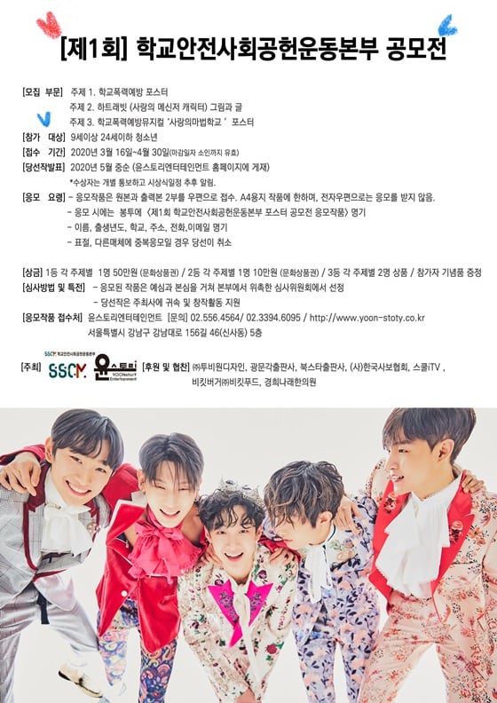 윤스토리엔터테인먼트는 지난 16일부터 학교안전사회공헌운동본부가 공동주최 하는 '제1회 학교안전사회공헌운동본부 공모전'이 진행되고 있다고 18일 밝혔다.