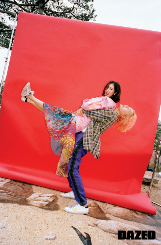 개인 컷에서도 스타일 아이콘인 두 사람의 모습을 확인할 수 있었는데, 현아는 레더 재킷에 블루 셔츠 드레스와 반다나 패턴의 팬츠를 각각 연출하여 뛰어난 패션 감각을 드러냈다.