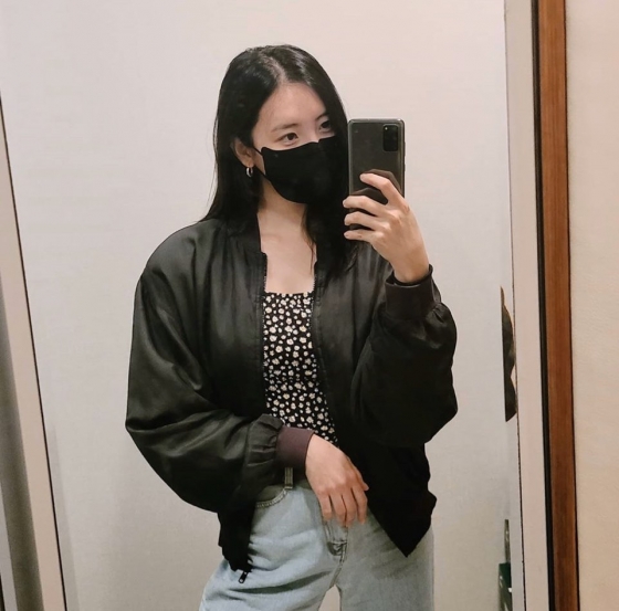 사진 속 선미는 마스크를 쓴채 거울샷을 찍고 있다. 플라워프린트 셔츠와 가죽자켓을 입고있다. 여기에 빈티지한 연청바지를 매치해 힙한 매력을 더했다.
