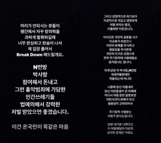 이것을 '단순 야동문제로 이번 사건을 가볍게 생각한다'라는 프레임으로 수많은 사람들이 저를 비판한 것은 인스타그램을 통해 단순한 음란물 제작 문제가 아닌 인터넷 성폭력이므로 관련 법안을 제정해달라는 나의 발언을 악의적으로 잘라낸 결과입니다."