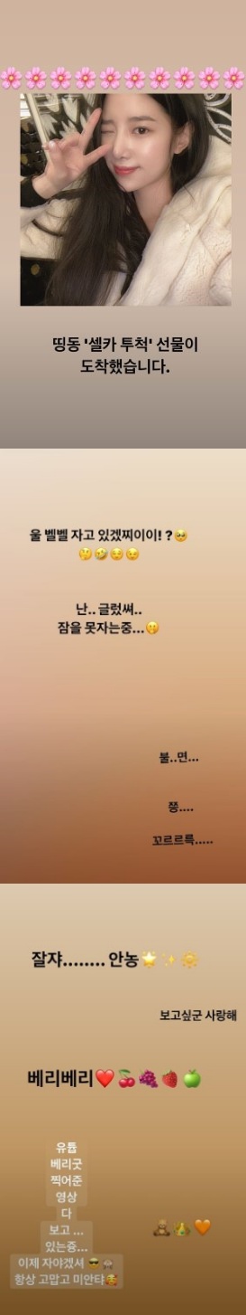 이어 "잘자.. 안녕. 보고 싶어 사랑해. 베리베리"라며 고백한 후 "유튜브 베리굿 찍어준 영상 다 보고 있는 중.. 이제 자야겠어. 항상 고맙고 미안해"라고 전했다.