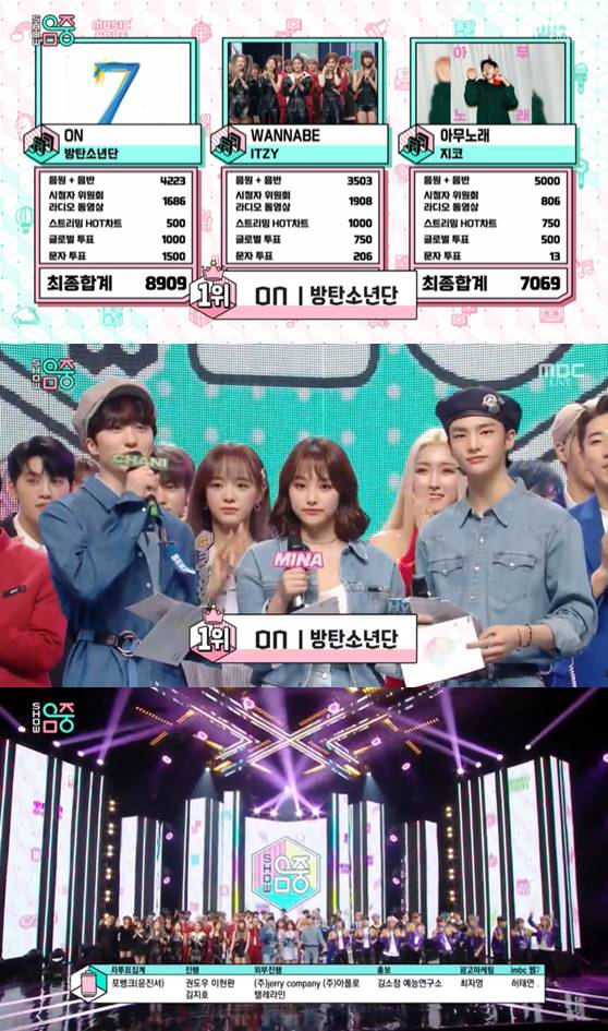 28일 오후 방송된 MBC 음악 프로그램 '쇼! 음악중심'(이하 '음중')에서는 방탄소년단이 1위를 차지했다. 이날 3월 4주차 1위 후보로 방탄소년단 'ON', ITZY 'WANNABE', 지코 '아무노래'가 1위 후보로 맞붙었다.