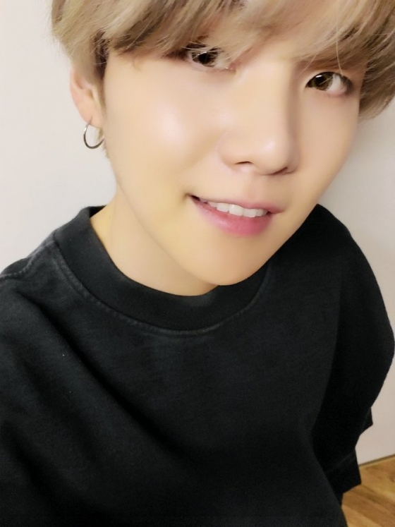 공개된 사진 속 슈가는 검은색 티를 입고 카메라를 보며 환하게 웃고 있다. 결점 없는 피부가 눈에 띈다.