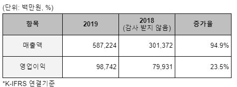 2019년 실적 발표..전년 동기 대비 매출액 95%, 영업이익 24% 증가