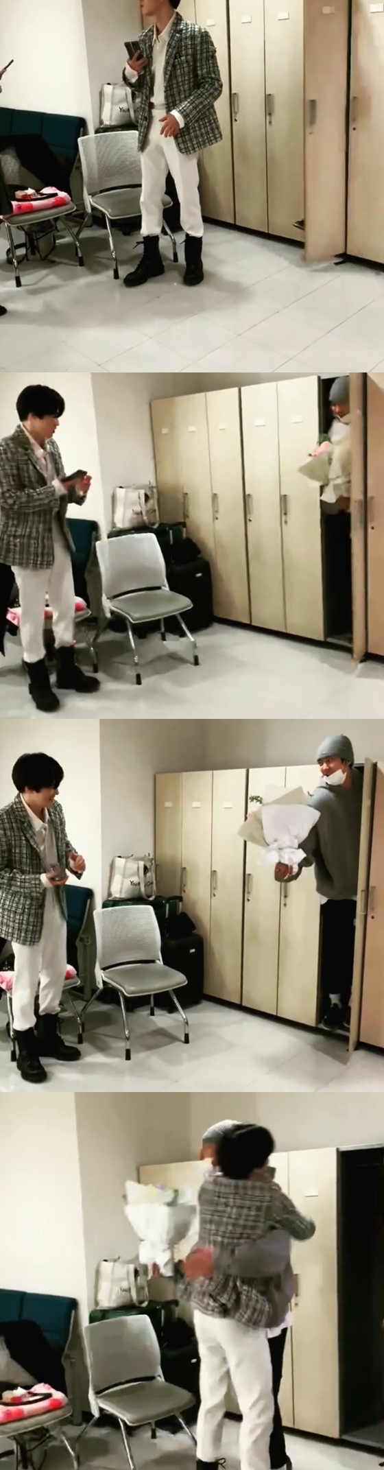 공개된 영상 속에는 음악 방송 대기실에서 대기 중인 수호의 모습이 담겼다. 이어 작은 캐비넷 문이 열리고 찬열이 깜짝 등장해 많은 이들의 관심이 집중됐다. 찬열은 마스크를 쓴 채 꽃다발을 들고 수호의 솔로 앨범 발매를 축하했다.
