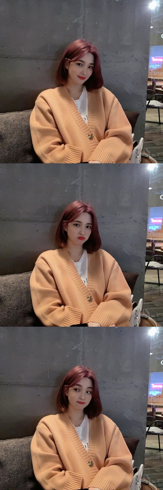 출산 후 버건디색 계열로 뿌리 염색을 한 율희는 오버핏 베이지색 카디건을 입고 환하게 웃으며 생동감 넘치는 모습을 보였다.