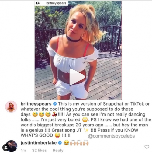브리트니 스피어스는 "이것은 요즘 여러분이 하는 틱톡 혹은 스냅챗 혹은 멋진 것의 영상이다. 보다시피 내가 춤을 잘추는 것은 아니지만, 좀 지루해서 해본다"며 댄스영상을 올렸다.