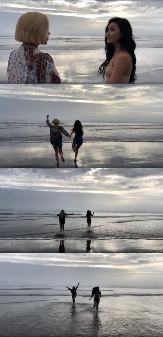 공개된 영상 속에는 화사와 휘인이 손을 잡고 함께 바다로 뛰어드는 모습이 담겼다. 그림 같은 하늘과 역광에 실루엣만 드러나는 둘의 모습이 단연 눈에 띈다. 동갑내기 화사와 휘인의 남다른 우정이 엿보여 영상을 보는 이들도 훈훈함을 느끼게 한다.