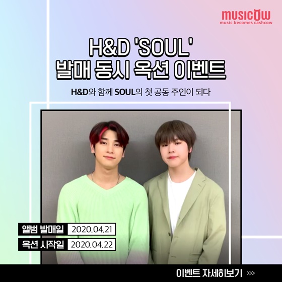 22일 세계 최초 저작권 공유 플랫폼 뮤직카우(구 뮤지코인)에 따르면 지난 21일 정식 미니 앨범 '소울메이트(SOULMATE)'로 데뷔한 H&D의 더블 타이틀곡 'SOUL'이 팬들과의 저작권 공유로 공개됐다.