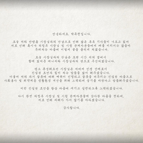 오늘 저와 안병용 시장님과의 만남으로 인해 많은 추측 기사들이 나오고 있어 저로 인해 혹시나 의정부 시장님 및 시청 관계자분들에게 폐를 끼치지는 않을까 우려되는 마음에 이렇게 글을 올리게 되었습니다.