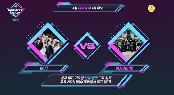 그룹 갓세븐(GOT7)과 (여자)아이들이 '엠카운트다운' 4월 마지막주 트로피를 두고 겨룬다.