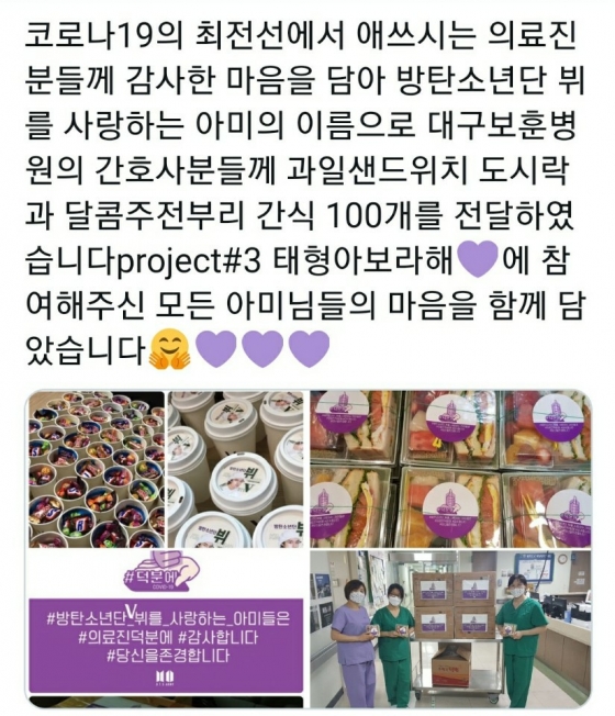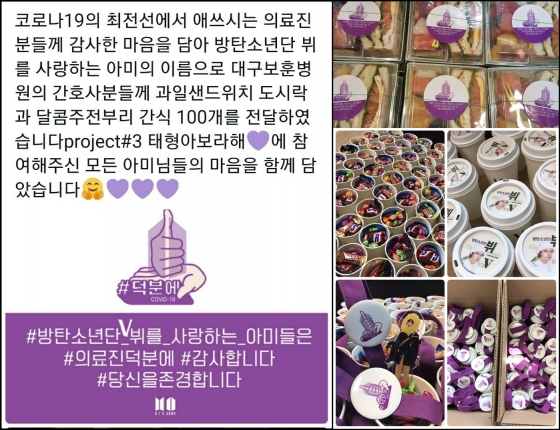 방탄소년단 뷔의 팬 계정 퍼플뷔는 대구보훈병원의 간호사들에게 도시락과 간식을 전하며 ‘#방탄소년단뷔를_사랑하는_아미들은 #의료진덕분에 #감사합니다 #당신을존경합니다’는 메시지와 “태형이가 우리에게 준 아름다운 선물로 위로받고 힐링되었듯 노고에 지치신 의료진분들께 조금이나마 달콤한 휴식이 되셨기를 바랍니다”라는 소망을 전했다.