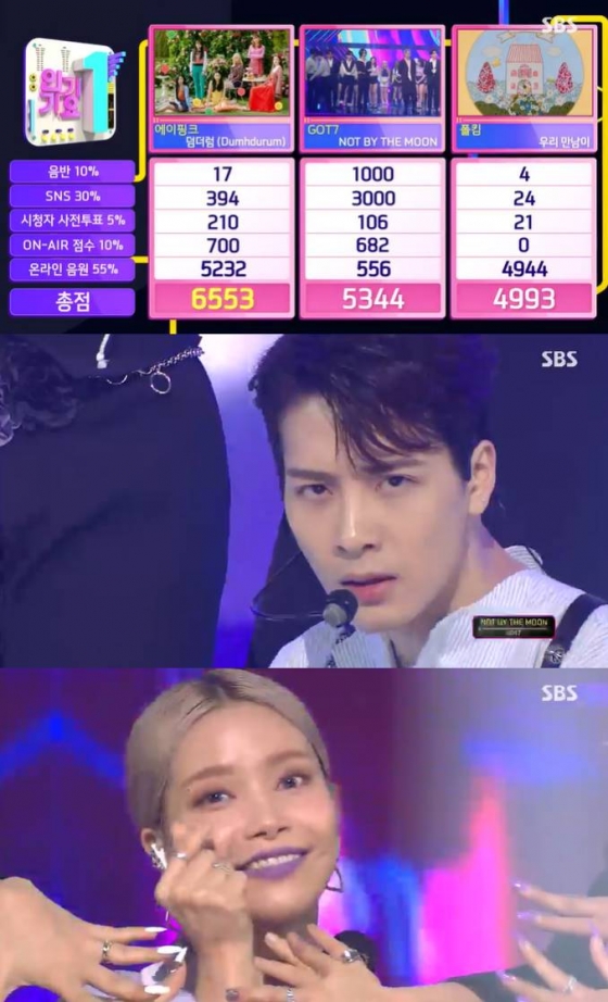 3일 오후 방송된 SBS 음악 프로그램 '인기가요'에서는 에이핑크 '덤더럼'(Dumhdurum)이 GOT7 'NOT BY THE MOON', 폴킴 '우리 만남이'를 제치고 1위를 차지했다.