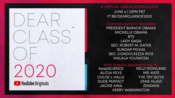 방탄소년단은 오는 6월 6일(미국시간) 유튜브 오리지널을 통해 온라인으로 펼쳐지는 'Dear Class of 2020'에 참여한다. 유튜브는 2020년에 졸업하는 전 세계의 대학생과 고등학생, 그리고 그들의 가족을 축하하기 위해 이번 가상 졸업식을 기획했다. 유튜브가 졸업식 관련 이벤트를 진행하는 건 이번이 처음이다.