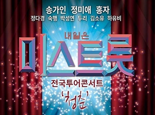 공개된 사진 속에는 '내일은 미스트롯 전국투어 콘서트 '청춘''이 적혀 있다. 콘서트에는 송가인을 비롯해 정미애, 홍자, 정다경, 숙행, 박성연, 두리, 김소유, 하유비가 출연한다.