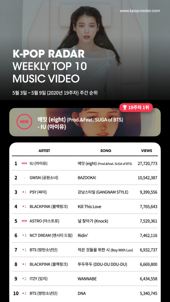아이유 신곡 '에잇'(Prod.&Feat. SUGA of BTS) 뮤직비디오는 지난 3일부터 9일까지 집계한 2020년 19주차 주간 케이팝 레이더 주간 유튜브 조회수 차트에서 약 2,772만 뷰를 기록하며 1위에 올랐다.
