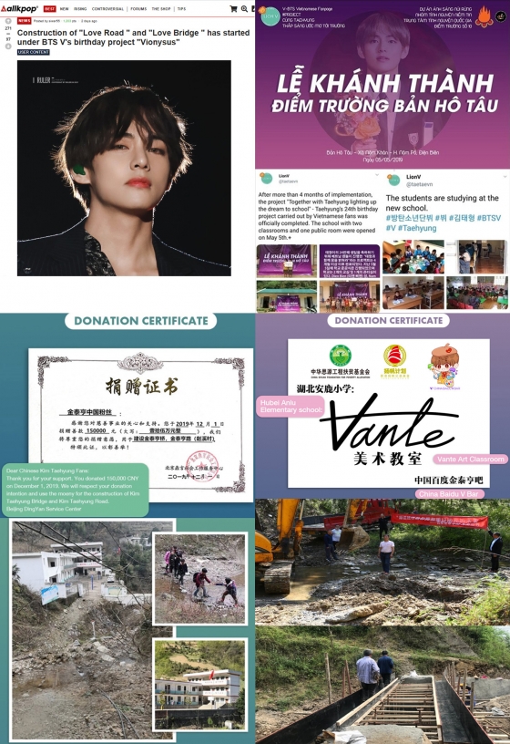 지난 해 5월 뷔의 베트남 팬들은 ‘태형과 함께 꿈을 밝히는 학교 프로젝트(Tea With Lighting Up The Dream To School)’를 통해 4개월간의 공사 끝에 ‘Dien Bien’ 지방의 어린이들에게 2개 교실을 갖춘 학교를 선물하기도 했다.