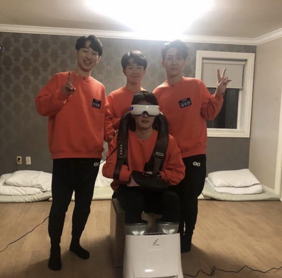 사진에서 각종 안마기구를 착용한 영탁은 김수찬, 남승민, 안성훈과 함께 포즈를 취하고 있다.